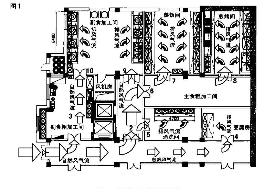 有壓差就會有氣流流動.就像水流動的原理一樣,水的流動要達到水平,空氣流動是要達到與大氣壓力相同。房間內(nèi)氣壓比大氣壓低,就會有氣流流入,比大氣壓高就會向外流動。與大氣相通的工作間始終要保持大氣壓。排煙罩排風時,氣流流向排罩,圖2中半空心箭頭所示,工作間內(nèi)和門窗的氣流要自然流入補充進來,平衡負壓。如空心箭頭所示。主副食加工間的排煙罩排風量最大,排風壓力也最大,門窗關(guān)閉時,由于流體內(nèi)任何一點的壓力是各向均等的,在一個房間內(nèi)的各處壓力也是相等的,負壓就作用在門窗上。離心風機產(chǎn)生的負壓,一般有幾百帕,克服煙道阻力余下的壓力.就作用在廚房內(nèi),1Pa=1N/㎡, 1公斤力=9.8N,在工作間內(nèi)產(chǎn)生的負壓,作用在一扇門上的壓力就很大了,使門開啟困難。