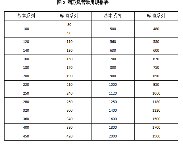 在安裝條件允許的情況下,在實際設計制作管道時,還需要根據需要選擇合理的結構尺寸。根據《通風管道技術規(guī)程》(JCJ141-2004)的規(guī)定,矩形風管的邊長與圓管直徑應盡量選用常用規(guī)格,見表1和表2。矩形風管長邊與短邊之比不宜大于4:1。金屬矩形風管宜以外邊長(或外徑)為標注尺寸;非金屬矩形風管宜以內邊長(或內徑)為標注尺寸。圓形風管應優(yōu)先選用表2中的基本系列。以下各表選自《通風與空調工程施工質量驗收規(guī)范》(GB50243-2002)