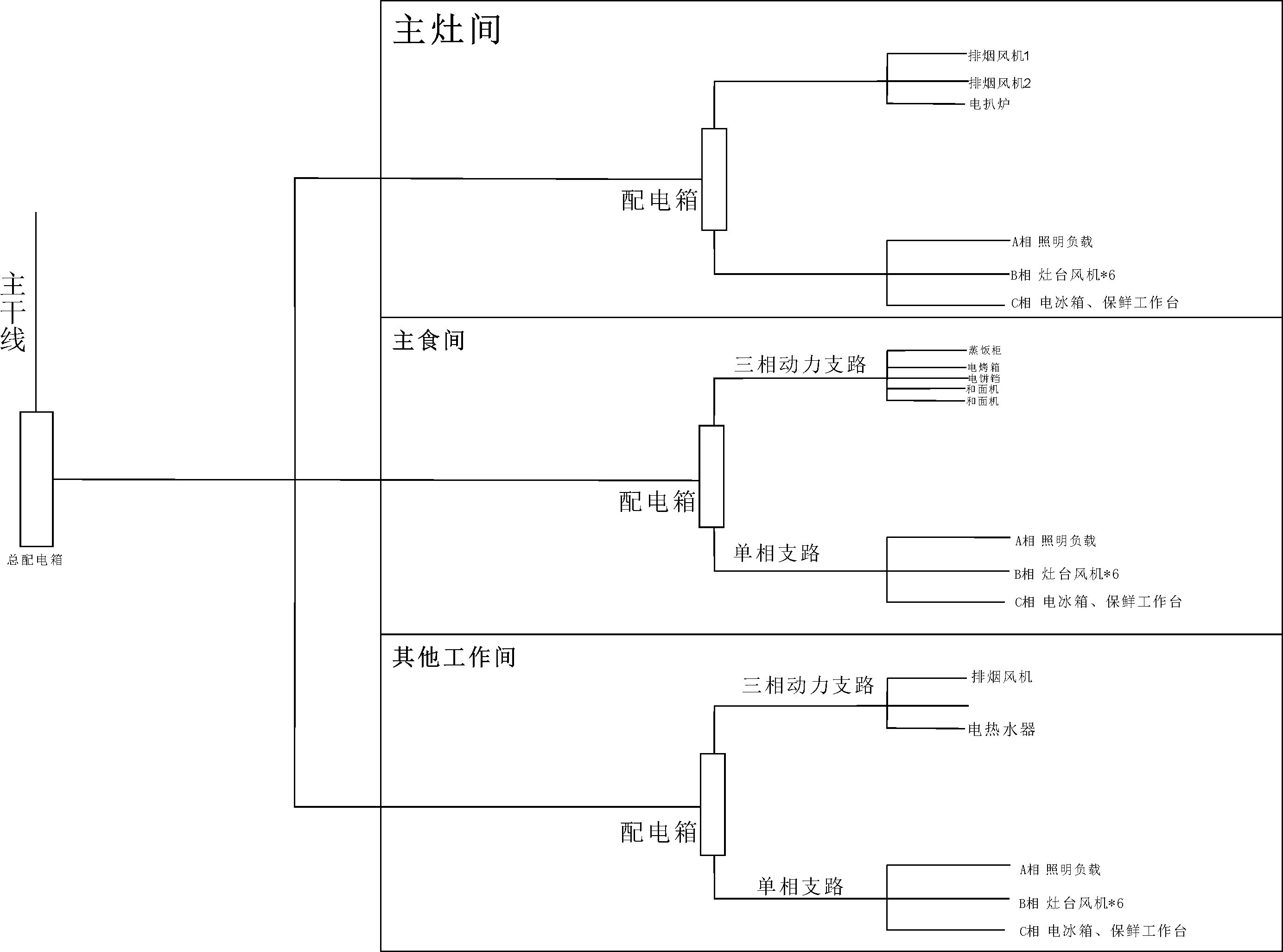 廚房供電系統(tǒng)用電負(fù)荷分為單相負(fù)荷與三相負(fù)荷、單相負(fù)荷主要為照明電,單相插座以及其他額定電壓為220V的電器用電。用電負(fù)荷的額定電壓均為單相220V,均勻分布到A、B、C三相。這類負(fù)荷也叫作相負(fù)荷。一般分為兩個(gè)獨(dú)立的系統(tǒng):照明系統(tǒng)和220V單相負(fù)荷動(dòng)力系統(tǒng)。單相負(fù)荷動(dòng)力系統(tǒng)通過單相插座向電冰柜、絞肉機(jī)、保鮮作臺(tái)、灶臺(tái)風(fēng)機(jī)供220V動(dòng)力電。380V三相負(fù)荷,分別供電到各個(gè)工作間額定電壓為380V的動(dòng)力支路,主要供蒸飯柜、傳菜電梯、電熱開水器、排燈風(fēng)機(jī)等廚房設(shè)備用電,線路不宜和其他獨(dú)立控制的設(shè)備接在同一個(gè)分支回路。具體情況見下圖: