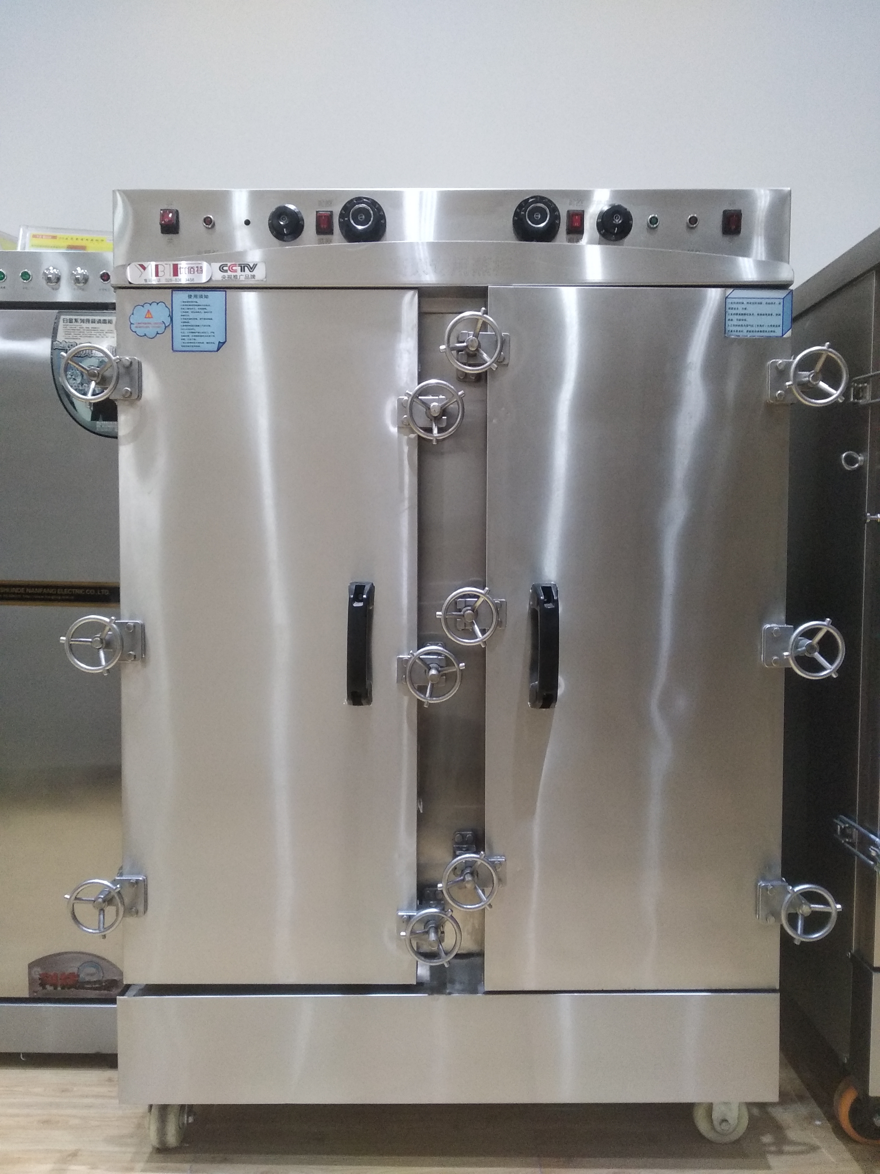 1. 蒸飯柜利用電、燃?xì)獍l(fā)熱,是大型廚房的烘烤設(shè)備。內(nèi)部采用不銹鋼方盤作為容器,在蒸汽柜的下方,為了方便移動(dòng),安裝有萬向輪,外形像車,所以又叫做蒸飯車。