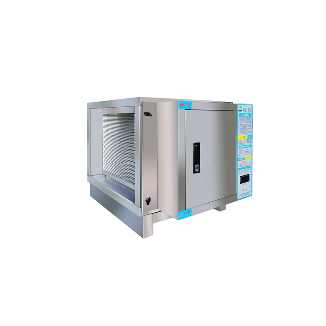 低空油煙凈化器為雙區(qū)式靜電吸附型,用來去除細(xì)微粒徑油煙分子和其它空氣中的雜粒。雙區(qū)式是指內(nèi)部電場(chǎng)的高壓電離區(qū)與低壓吸附區(qū),氣體中的油煙微粒在經(jīng)過電場(chǎng)的高壓電離區(qū)時(shí),油煙分子會(huì)被電離并帶有正或負(fù)電荷;之后經(jīng)過低壓區(qū)時(shí),將會(huì)因電場(chǎng)力的效果而吸附在極板上,流向集油槽。
