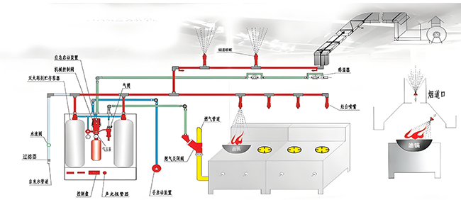 3、廚房專用滅火裝置:廚房專用滅火裝置是由滅火劑儲(chǔ)瓶與關(guān)斷燃料閥機(jī)構(gòu)、機(jī)械驅(qū)動(dòng)裝置、霧化與噴頭管網(wǎng)、感溫易熔金屬探測器與控制管路、手動(dòng)應(yīng)急啟動(dòng)等組成。廚房安裝該系統(tǒng)之后,可24小時(shí)不間斷的對廚房的灶臺(tái)、集油煙罩、排煙管道進(jìn)行全方位的消防保護(hù)。